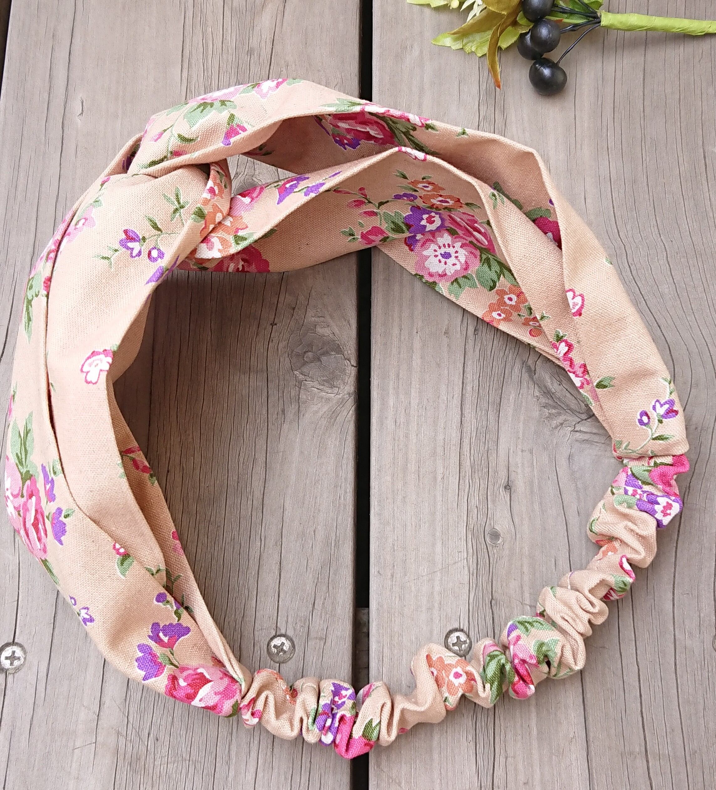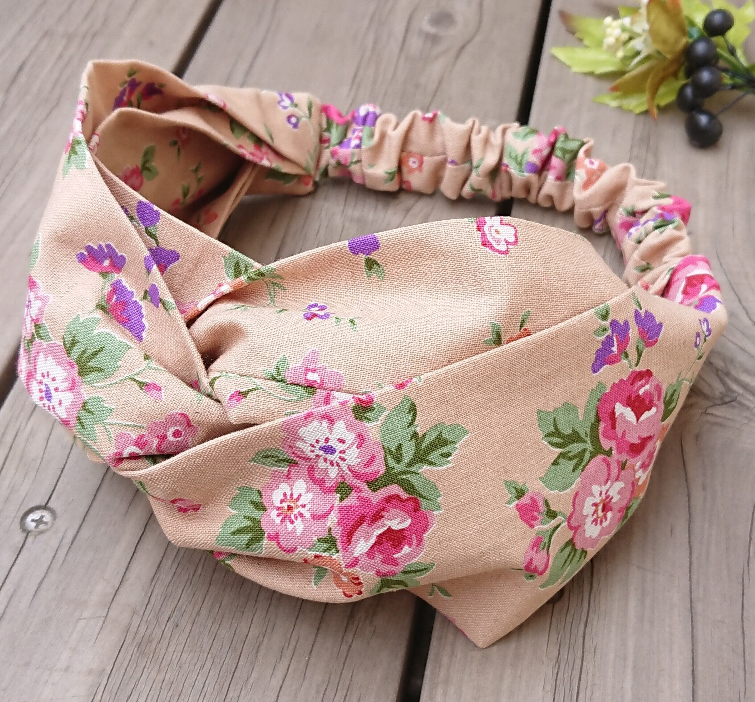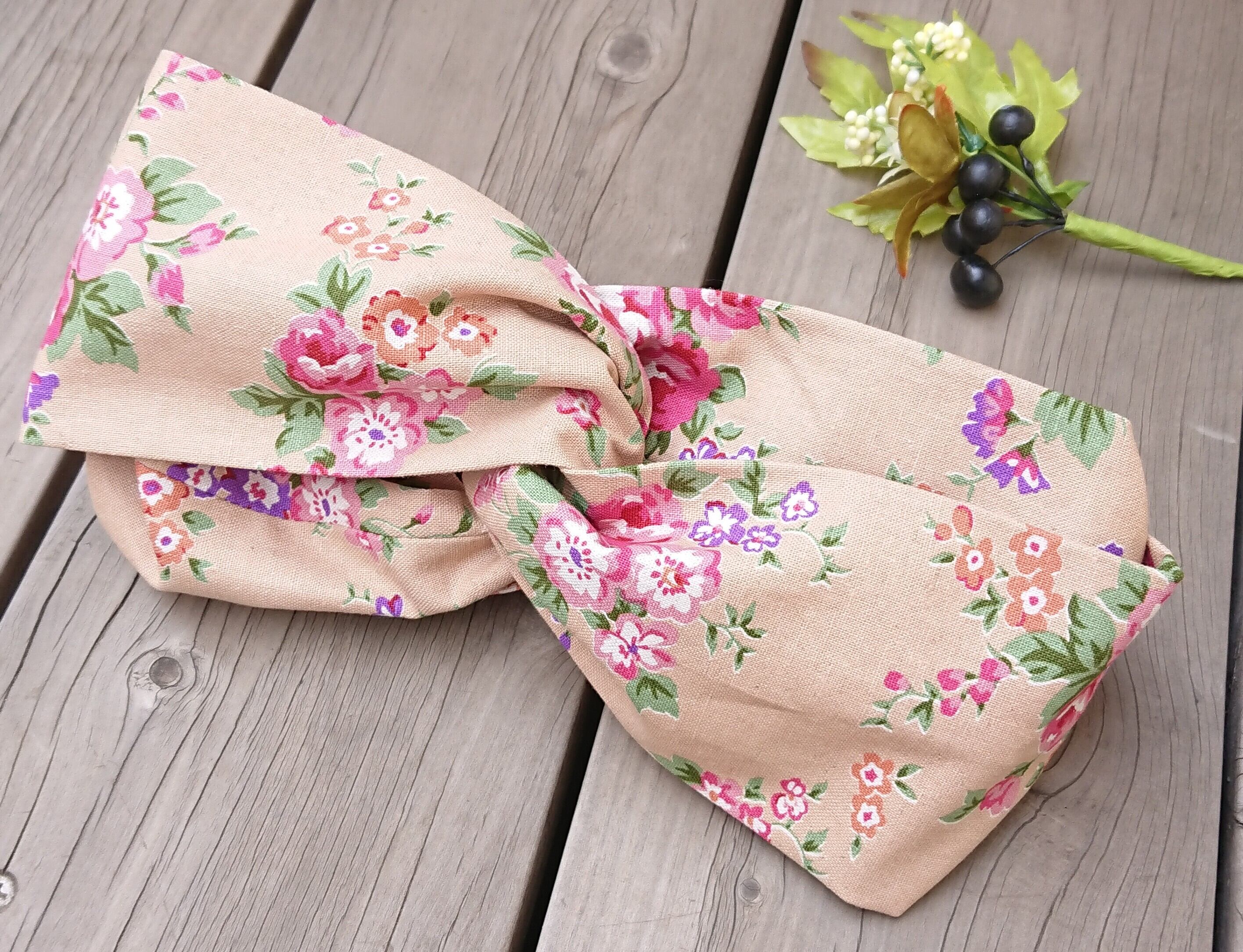 ナチュラルな花柄が可愛い、ハンドメイドのボリューミーなクロスターバン、ヘアバンドです。